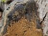 Šobrīd varu iedomāties 2 variantus - melnā plaispika Amaurochaete atra vai parastais gļotpūpēdis Reticularia lycoperdon. Pēc izmēra, augšanas laika un augšanas uz apstrādāta koka atbilst abas.