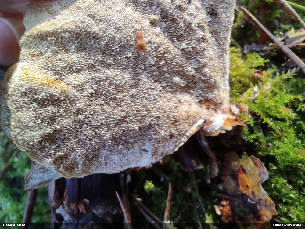 Šīm paraugs nav saglabājies? Nevaru saprast, vai sporas ir ar tīkliņu no adatiņām, vai ar līnijām. Īsti nesanāk neviena man zināma suga.
