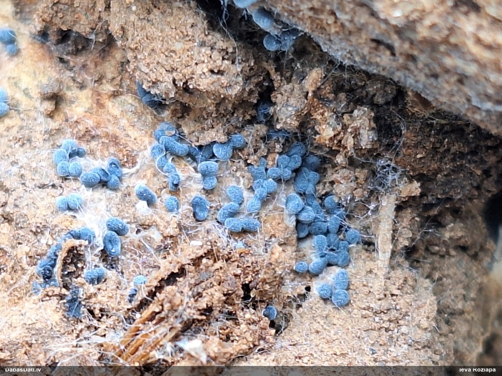 Paldies, Raivo! Ar acu gaišumu man arvien sliktāk, bet mikroskops palīdz. Jā, gribēju teikt, ka paraugam, ja vien nav kāda jutīga atradne, kurai drīkst ievākt tikai mazu gabaliņu, vērts ievākt lielāku gabalu, jo gļotsēnēm patīk kompānija. Un mikroskopa mazajos palielinājumos ar sānu papildus apgaismojumu ir vērts rūpīgi "izstaigāt" visu paraugu. Arī ķērpjus un interesantas sīksēnītes tā var atrast, ko dabā nepamanītu. Ar kriksītēm ir dažādi - pirmās es tā arī tikai citu sugu paraugos pamanīju, bet vēlāk redzēju arī dabā kriskīšu plantācijas - ja to ir daudz, tad var pamanīt jau dabā. Uz sūnām gan ir ekstrēms gadījums, dabā droši nepamanītu, arī eksemplāra noņemšana no sūnas nebija pārāk veiksmīga, tāpēc par noteikšanu mazliet šaubos (sporām mazliet cits tonis). Bet pagaidām citas hipotēzes nav (un konkrētā eksemplāra arī vairs ne).