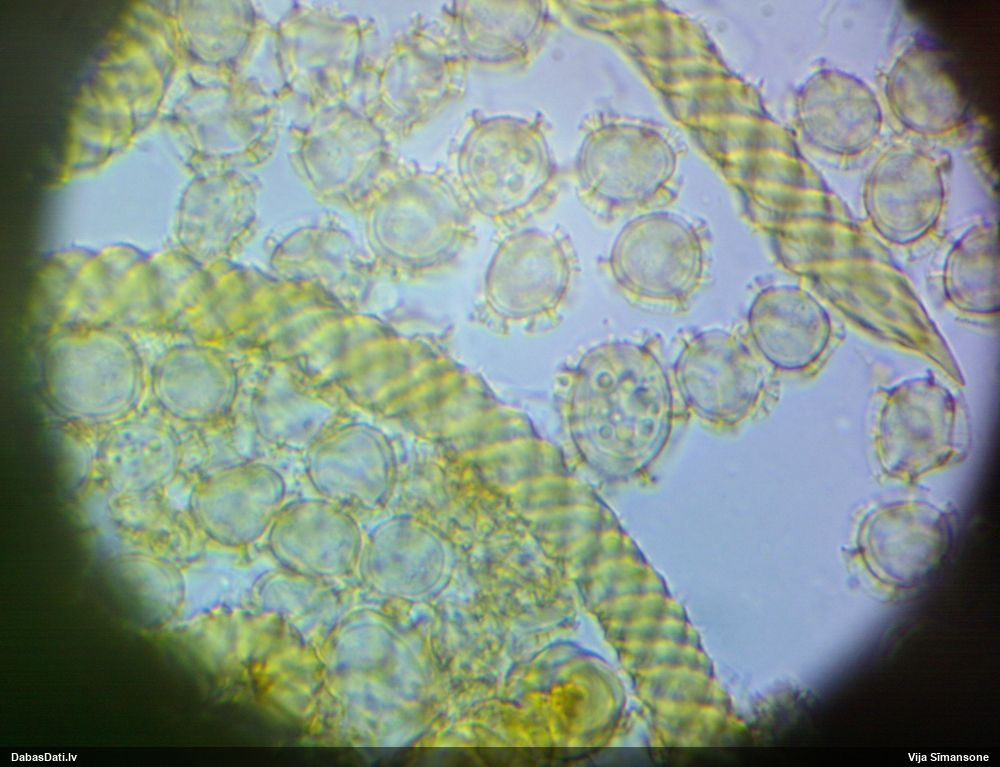 Sporas izskatās ļoti gaišas, varbūt nenobriedušas. Es laikam pēc kāda laiciņa mēģinātu vēlreiz mikroskopēt. Tajā pašā laikā sporu izmēri priekš T.contorta ir pamazi (ja tipiski ir 11-14 mkm, te ir knapi 11 mkm)