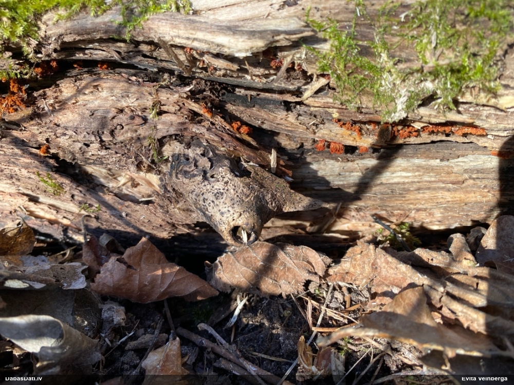 Satrūdējusi kritala mežā, nav dēļi. Iespējams, egle, jauktu koku mežs.