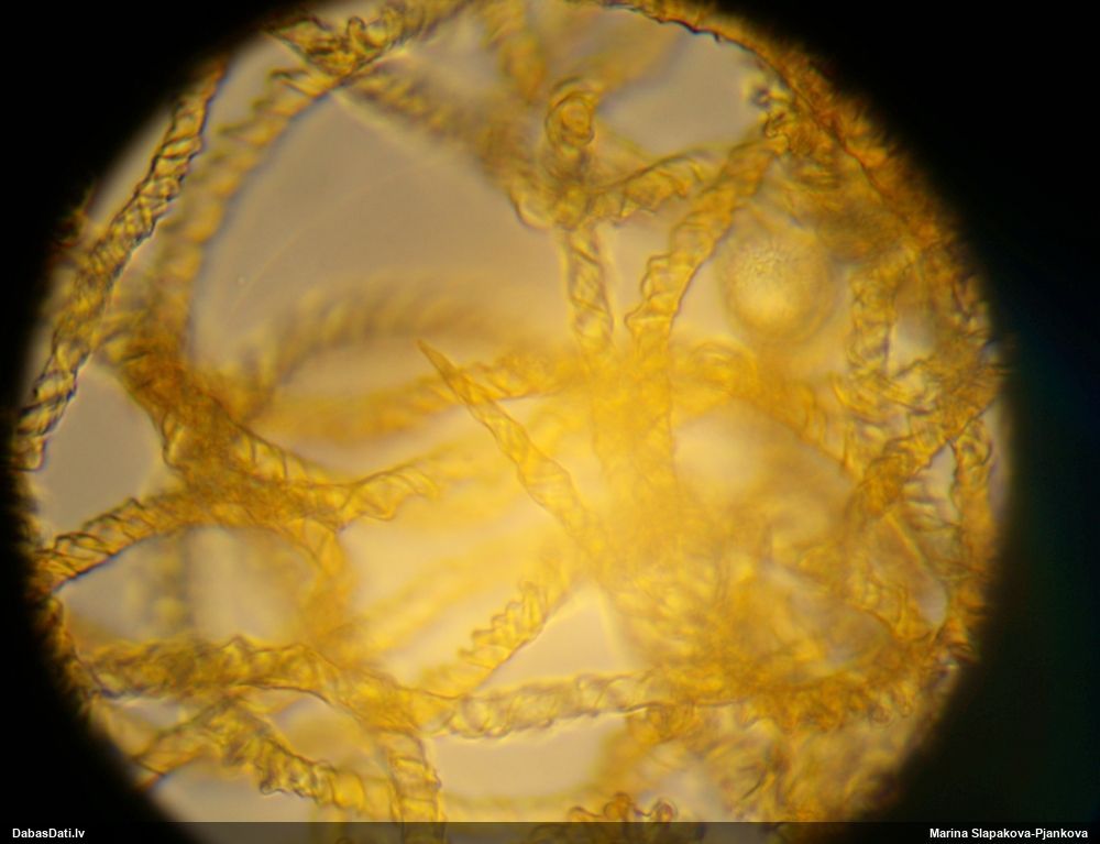 Šis man pašai sanāca pārsteigums. Ievācu paraugu ar domu "varbūt tur ir gļotsēne", dodot varbūtību apmēram pusprocentu, ka ir. Bet no mikroskopijas starp galīgi vecām sporām izdevās atrast ne tikai dažas labas, bet, galvenais, arī perfektus kapilīcija fragmentus, no kura suga, vēl kopā ar sporu pazīmēm, nosakāma nešaubīgi.
