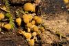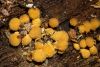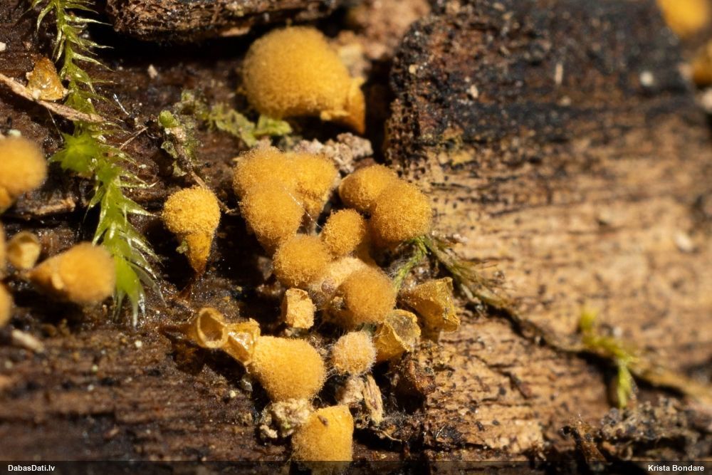 Man pēkšņi radās ideja - vai tur bija nu ļoti mitrs mikroklimats, egle ar melnalksni? Hipotētiski tādas dzeltenas var būt Diachea muscorum. Te bilde ir mazliet līdzīga: https://fr.wikipedia.org/wiki/Fichier:Craterium_muscorum,_Trawscoed,_North_Wales,_Aug_2016_-_Flickr_-_janetgraham84.jpg