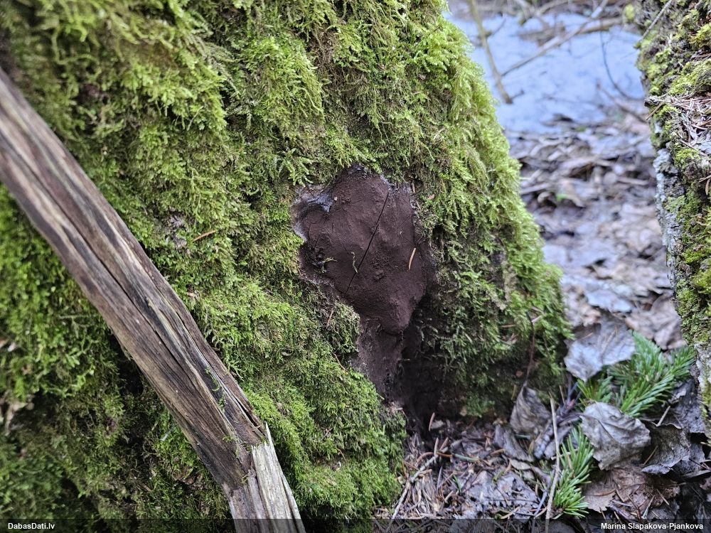 Satrūdējusi kritala mežā, nav dēļi. Iespējams, egle, jauktu koku mežs.