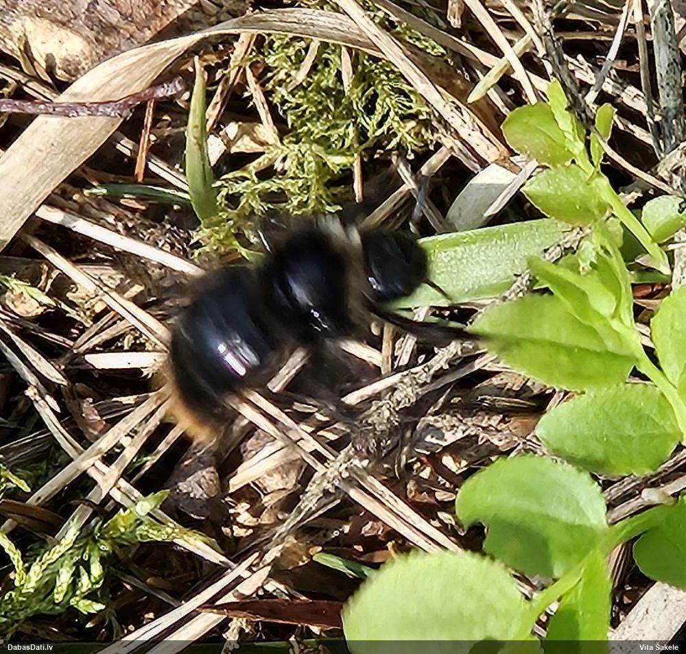 Jāredz tuvāk (kaut vai izkadrēts šis pats attēls) - varbūt tumšā eļļasvabole (Meloe proscarabaeus)