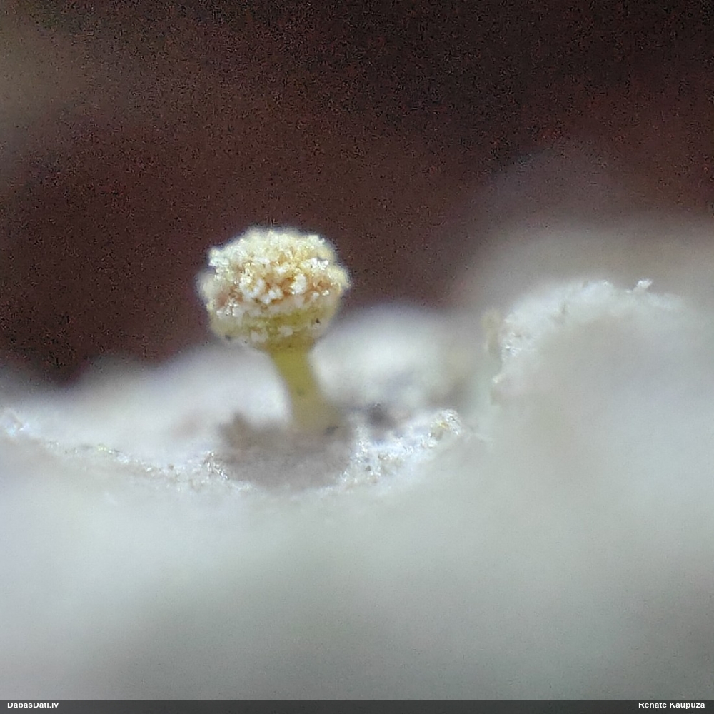 Paldies, Raivo! Ar acu gaišumu man arvien sliktāk, bet mikroskops palīdz. Jā, gribēju teikt, ka paraugam, ja vien nav kāda jutīga atradne, kurai drīkst ievākt tikai mazu gabaliņu, vērts ievākt lielāku gabalu, jo gļotsēnēm patīk kompānija. Un mikroskopa mazajos palielinājumos ar sānu papildus apgaismojumu ir vērts rūpīgi "izstaigāt" visu paraugu. Arī ķērpjus un interesantas sīksēnītes tā var atrast, ko dabā nepamanītu. Ar kriksītēm ir dažādi - pirmās es tā arī tikai citu sugu paraugos pamanīju, bet vēlāk redzēju arī dabā kriskīšu plantācijas - ja to ir daudz, tad var pamanīt jau dabā. Uz sūnām gan ir ekstrēms gadījums, dabā droši nepamanītu, arī eksemplāra noņemšana no sūnas nebija pārāk veiksmīga, tāpēc par noteikšanu mazliet šaubos (sporām mazliet cits tonis). Bet pagaidām citas hipotēzes nav (un konkrētā eksemplāra arī vairs ne).