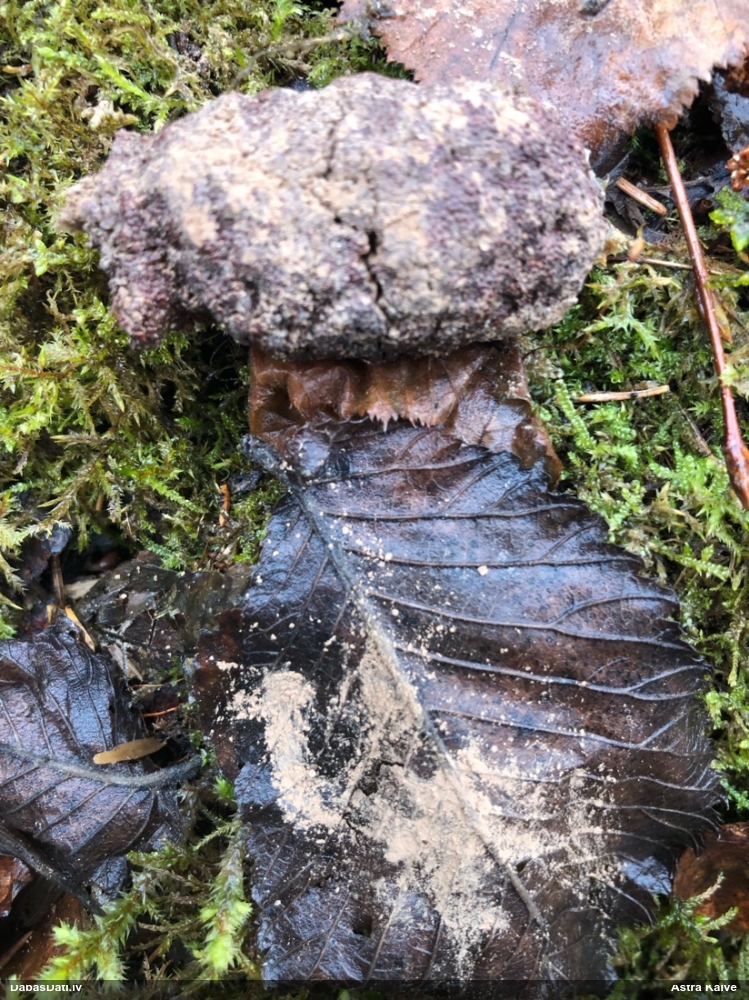 Lai arī Edvīns šo ir skatījis, nesen viņš ir teicis, ka ragansviestus īpaši nav pētījis, turklāt tieši par F.intermedia man stāv atmiņā, ka viņš to vai nu neatzīst, vai īsti nav redzējis, tāpēc pieļauju, ka viņš to varētu arī labi nezināt. Tā kā pati atradu tādu, kas, manuprāt, pēc visām pazīmēm atbilst F.intermedia, tad salīdzināju ar šo, un man izskatās abi ļoti līdzīgi gan pēc iekšējām struktūrām (kā cieši daudzi augļķermeņi kopā sablīvēti), gan pēc sporām (ar izteiktām mazākām un lielāku, treknāku kārpu grupām). Un lai vai kā, šai ir lielākas sporas nekā F.septica tipiski ir (6-9 mkm un 9-11 mkm tomēr nav gluži tas pats, pat ja "9" pārklājas). Un vācu noteicējā tulkojumā par F.intermedia atradumu teikts "Nobriedušas ētālijas bija veidojušās ar vai bez garozas, un pēdējā gadījumā bieži bija rozā krāsā." - un te ir tas rozā gadījums. Turklāt F.intermedia nereti aug uz dzīviem augiem (un sūnas tādas ir). Tā ka es tomēr palieku pie F.intermedia viedokļa.