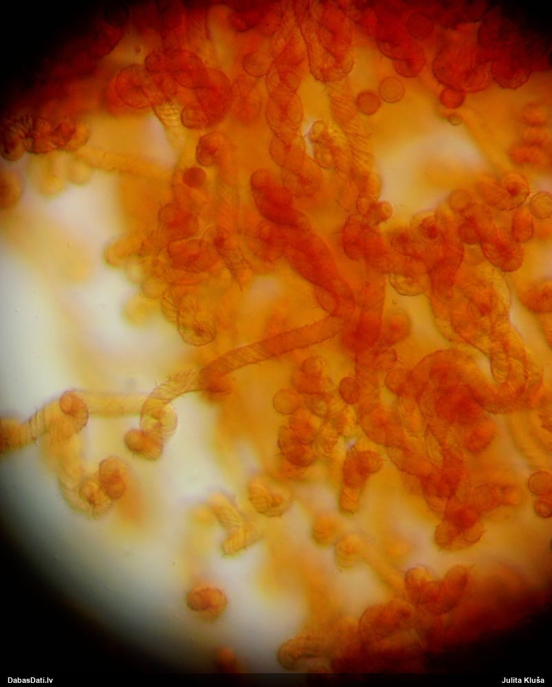 Šis man pašai sanāca pārsteigums. Ievācu paraugu ar domu "varbūt tur ir gļotsēne", dodot varbūtību apmēram pusprocentu, ka ir. Bet no mikroskopijas starp galīgi vecām sporām izdevās atrast ne tikai dažas labas, bet, galvenais, arī perfektus kapilīcija fragmentus, no kura suga, vēl kopā ar sporu pazīmēm, nosakāma nešaubīgi.
