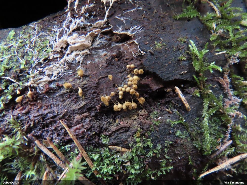 Man pēkšņi radās ideja - vai tur bija nu ļoti mitrs mikroklimats, egle ar melnalksni? Hipotētiski tādas dzeltenas var būt Diachea muscorum. Te bilde ir mazliet līdzīga: https://fr.wikipedia.org/wiki/Fichier:Craterium_muscorum,_Trawscoed,_North_Wales,_Aug_2016_-_Flickr_-_janetgraham84.jpg