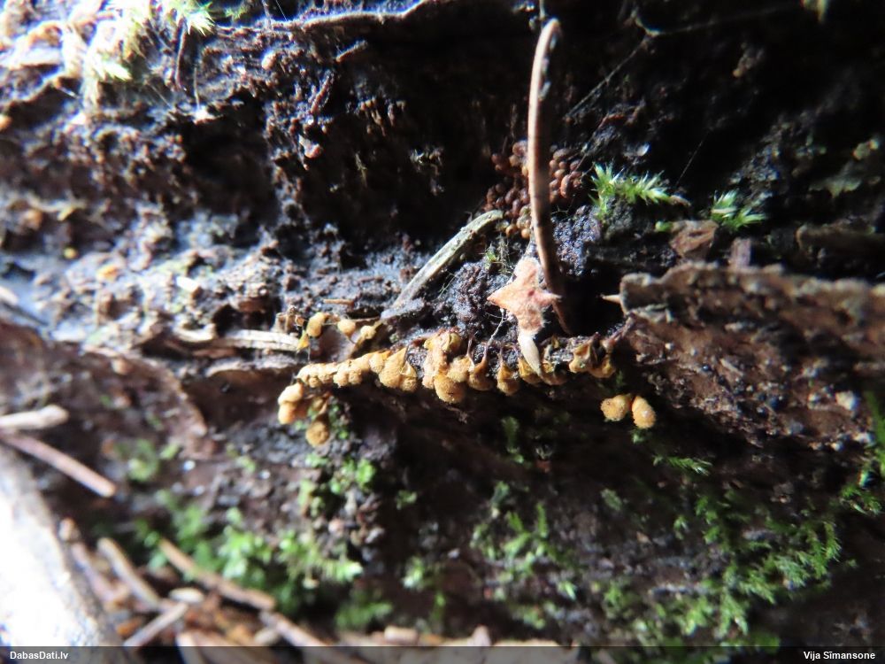 Paldies, Raivo! Ar acu gaišumu man arvien sliktāk, bet mikroskops palīdz. Jā, gribēju teikt, ka paraugam, ja vien nav kāda jutīga atradne, kurai drīkst ievākt tikai mazu gabaliņu, vērts ievākt lielāku gabalu, jo gļotsēnēm patīk kompānija. Un mikroskopa mazajos palielinājumos ar sānu papildus apgaismojumu ir vērts rūpīgi "izstaigāt" visu paraugu. Arī ķērpjus un interesantas sīksēnītes tā var atrast, ko dabā nepamanītu. Ar kriksītēm ir dažādi - pirmās es tā arī tikai citu sugu paraugos pamanīju, bet vēlāk redzēju arī dabā kriskīšu plantācijas - ja to ir daudz, tad var pamanīt jau dabā. Uz sūnām gan ir ekstrēms gadījums, dabā droši nepamanītu, arī eksemplāra noņemšana no sūnas nebija pārāk veiksmīga, tāpēc par noteikšanu mazliet šaubos (sporām mazliet cits tonis). Bet pagaidām citas hipotēzes nav (un konkrētā eksemplāra arī vairs ne).