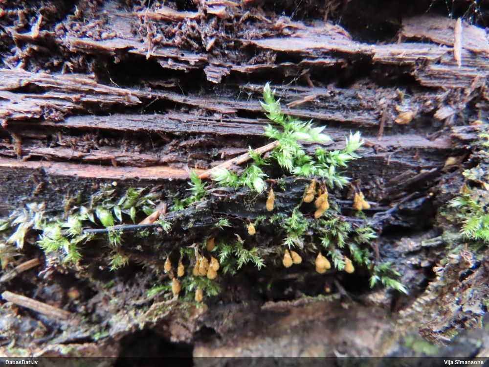 Paldies, Raivo! Ar acu gaišumu man arvien sliktāk, bet mikroskops palīdz. Jā, gribēju teikt, ka paraugam, ja vien nav kāda jutīga atradne, kurai drīkst ievākt tikai mazu gabaliņu, vērts ievākt lielāku gabalu, jo gļotsēnēm patīk kompānija. Un mikroskopa mazajos palielinājumos ar sānu papildus apgaismojumu ir vērts rūpīgi "izstaigāt" visu paraugu. Arī ķērpjus un interesantas sīksēnītes tā var atrast, ko dabā nepamanītu. Ar kriksītēm ir dažādi - pirmās es tā arī tikai citu sugu paraugos pamanīju, bet vēlāk redzēju arī dabā kriskīšu plantācijas - ja to ir daudz, tad var pamanīt jau dabā. Uz sūnām gan ir ekstrēms gadījums, dabā droši nepamanītu, arī eksemplāra noņemšana no sūnas nebija pārāk veiksmīga, tāpēc par noteikšanu mazliet šaubos (sporām mazliet cits tonis). Bet pagaidām citas hipotēzes nav (un konkrētā eksemplāra arī vairs ne).