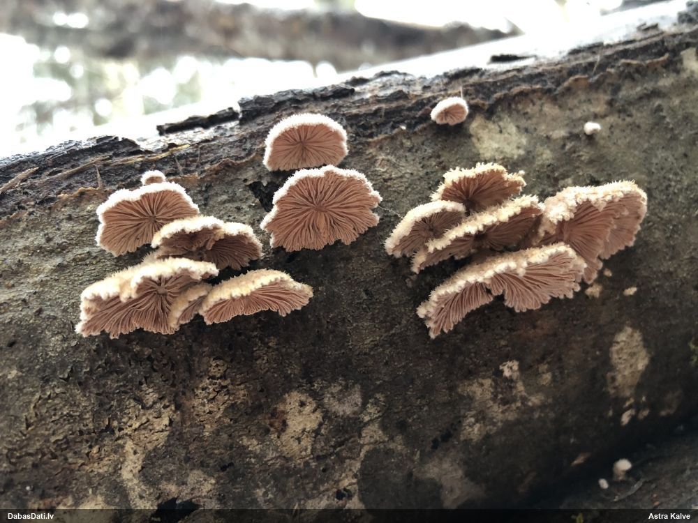 Es teiktu, ka Pleurotus cornucopiae: Cepurītes krāsa tik gaiši bēša nav pat vairākkārt salušām P.osteatus, bet šīs ir svaigi izaugušas. Lapiņas izteikti vērstas uz leju un veido kātiņa apakšā neregulāru rakstu, ko sauc par "anastomozes" tīklu.