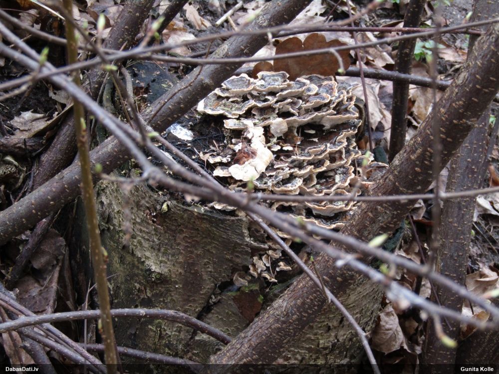 Satrūdējusi kritala mežā, nav dēļi. Iespējams, egle, jauktu koku mežs.