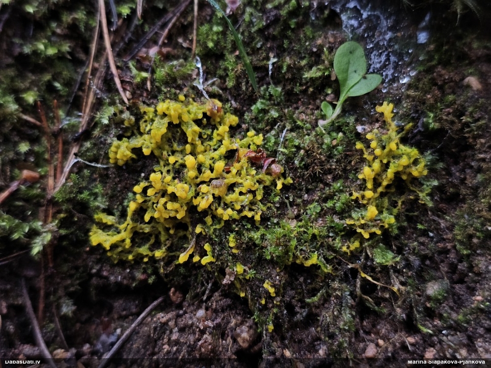 Man pēkšņi radās ideja - vai tur bija nu ļoti mitrs mikroklimats, egle ar melnalksni? Hipotētiski tādas dzeltenas var būt Diachea muscorum. Te bilde ir mazliet līdzīga: https://fr.wikipedia.org/wiki/Fichier:Craterium_muscorum,_Trawscoed,_North_Wales,_Aug_2016_-_Flickr_-_janetgraham84.jpg