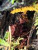 Man pēkšņi radās ideja - vai tur bija nu ļoti mitrs mikroklimats, egle ar melnalksni? Hipotētiski tādas dzeltenas var būt Diachea muscorum. Te bilde ir mazliet līdzīga: https://fr.wikipedia.org/wiki/Fichier:Craterium_muscorum,_Trawscoed,_North_Wales,_Aug_2016_-_Flickr_-_janetgraham84.jpg