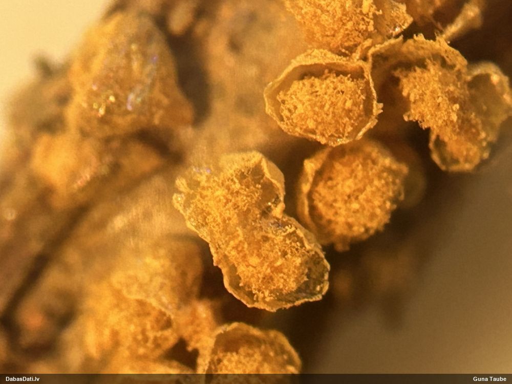 Paldies, Raivo! Ar acu gaišumu man arvien sliktāk, bet mikroskops palīdz. Jā, gribēju teikt, ka paraugam, ja vien nav kāda jutīga atradne, kurai drīkst ievākt tikai mazu gabaliņu, vērts ievākt lielāku gabalu, jo gļotsēnēm patīk kompānija. Un mikroskopa mazajos palielinājumos ar sānu papildus apgaismojumu ir vērts rūpīgi "izstaigāt" visu paraugu. Arī ķērpjus un interesantas sīksēnītes tā var atrast, ko dabā nepamanītu. Ar kriksītēm ir dažādi - pirmās es tā arī tikai citu sugu paraugos pamanīju, bet vēlāk redzēju arī dabā kriskīšu plantācijas - ja to ir daudz, tad var pamanīt jau dabā. Uz sūnām gan ir ekstrēms gadījums, dabā droši nepamanītu, arī eksemplāra noņemšana no sūnas nebija pārāk veiksmīga, tāpēc par noteikšanu mazliet šaubos (sporām mazliet cits tonis). Bet pagaidām citas hipotēzes nav (un konkrētā eksemplāra arī vairs ne).