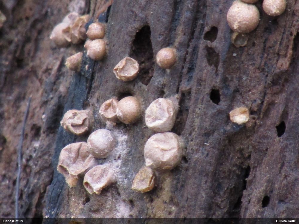 Šobrīd varu iedomāties 2 variantus - melnā plaispika Amaurochaete atra vai parastais gļotpūpēdis Reticularia lycoperdon. Pēc izmēra, augšanas laika un augšanas uz apstrādāta koka atbilst abas.