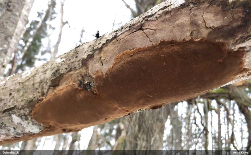 Ja uz beigta koka, tad ticamākā laikam ir B.affinis var. microspora, lai gan tā aug uz mizas. Bet varbūt tieši apakšā gļotsēnēm ir kādi mizas fragmentiņi?