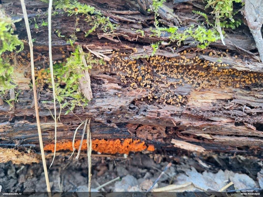 Domāju to Sorocybe resinae, ja tā, tad esmu soli tuvāk mērķim, nu zinu, kā izskatās un kur meklēt. Gļotsēnītes klāt gan nebija.