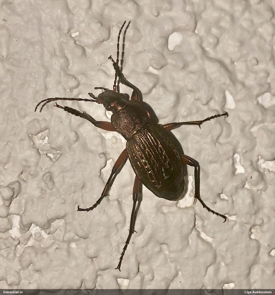 Jāredz tuvāk (kaut vai izkadrēts šis pats attēls) - varbūt tumšā eļļasvabole (Meloe proscarabaeus)