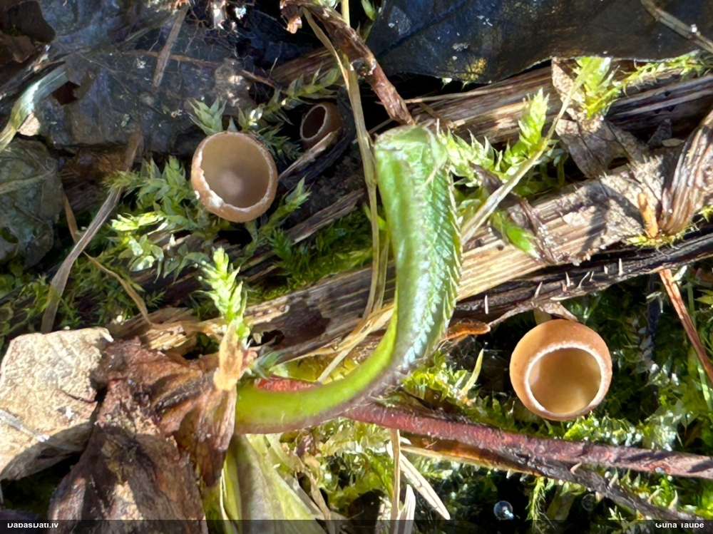 Man pēkšņi radās ideja - vai tur bija nu ļoti mitrs mikroklimats, egle ar melnalksni? Hipotētiski tādas dzeltenas var būt Diachea muscorum. Te bilde ir mazliet līdzīga: https://fr.wikipedia.org/wiki/Fichier:Craterium_muscorum,_Trawscoed,_North_Wales,_Aug_2016_-_Flickr_-_janetgraham84.jpg