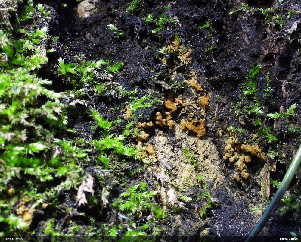Paldies, Raivo! Ar acu gaišumu man arvien sliktāk, bet mikroskops palīdz. Jā, gribēju teikt, ka paraugam, ja vien nav kāda jutīga atradne, kurai drīkst ievākt tikai mazu gabaliņu, vērts ievākt lielāku gabalu, jo gļotsēnēm patīk kompānija. Un mikroskopa mazajos palielinājumos ar sānu papildus apgaismojumu ir vērts rūpīgi "izstaigāt" visu paraugu. Arī ķērpjus un interesantas sīksēnītes tā var atrast, ko dabā nepamanītu. Ar kriksītēm ir dažādi - pirmās es tā arī tikai citu sugu paraugos pamanīju, bet vēlāk redzēju arī dabā kriskīšu plantācijas - ja to ir daudz, tad var pamanīt jau dabā. Uz sūnām gan ir ekstrēms gadījums, dabā droši nepamanītu, arī eksemplāra noņemšana no sūnas nebija pārāk veiksmīga, tāpēc par noteikšanu mazliet šaubos (sporām mazliet cits tonis). Bet pagaidām citas hipotēzes nav (un konkrētā eksemplāra arī vairs ne).