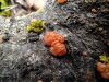 Man pēkšņi radās ideja - vai tur bija nu ļoti mitrs mikroklimats, egle ar melnalksni? Hipotētiski tādas dzeltenas var būt Diachea muscorum. Te bilde ir mazliet līdzīga: https://fr.wikipedia.org/wiki/Fichier:Craterium_muscorum,_Trawscoed,_North_Wales,_Aug_2016_-_Flickr_-_janetgraham84.jpg