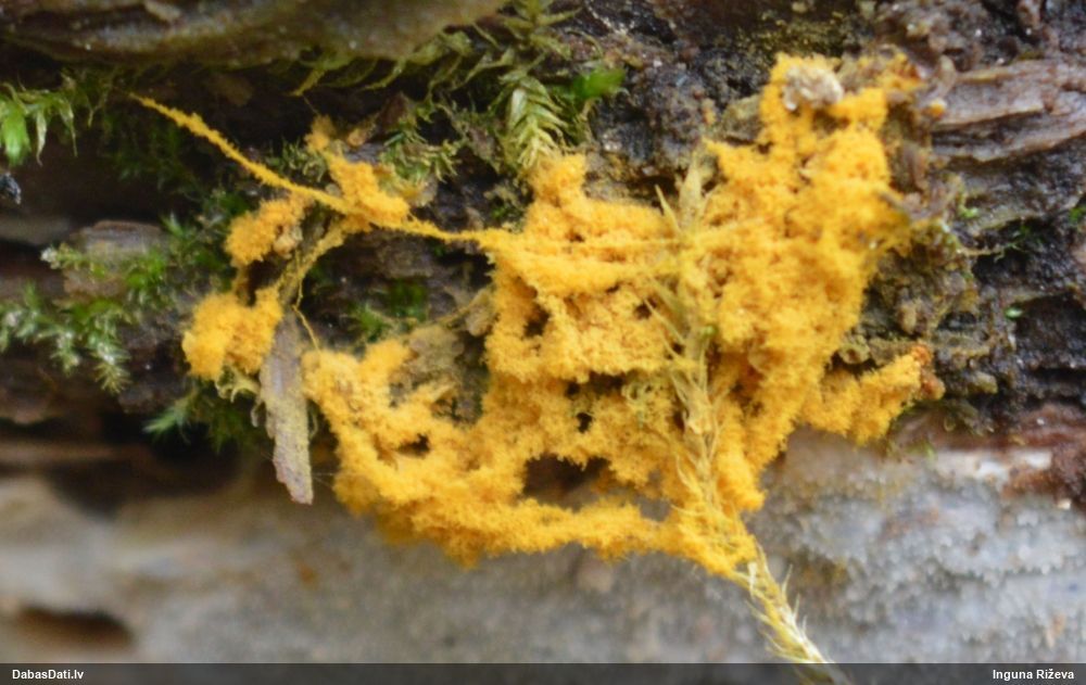 Man pēkšņi radās ideja - vai tur bija nu ļoti mitrs mikroklimats, egle ar melnalksni? Hipotētiski tādas dzeltenas var būt Diachea muscorum. Te bilde ir mazliet līdzīga: https://fr.wikipedia.org/wiki/Fichier:Craterium_muscorum,_Trawscoed,_North_Wales,_Aug_2016_-_Flickr_-_janetgraham84.jpg
