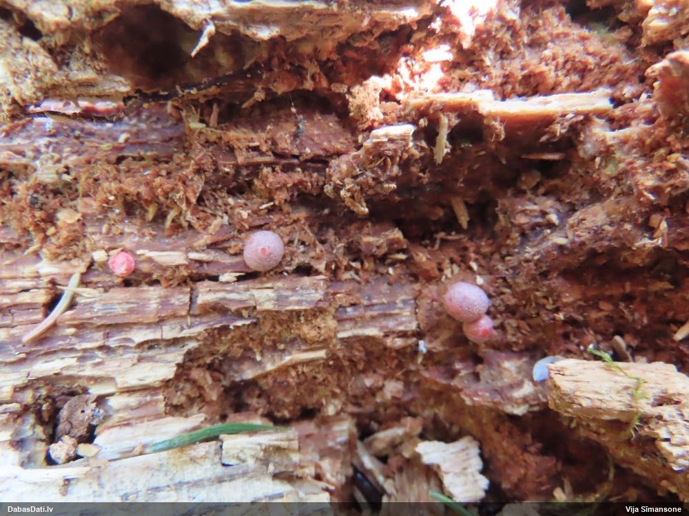 Šobrīd varu iedomāties 2 variantus - melnā plaispika Amaurochaete atra vai parastais gļotpūpēdis Reticularia lycoperdon. Pēc izmēra, augšanas laika un augšanas uz apstrādāta koka atbilst abas.