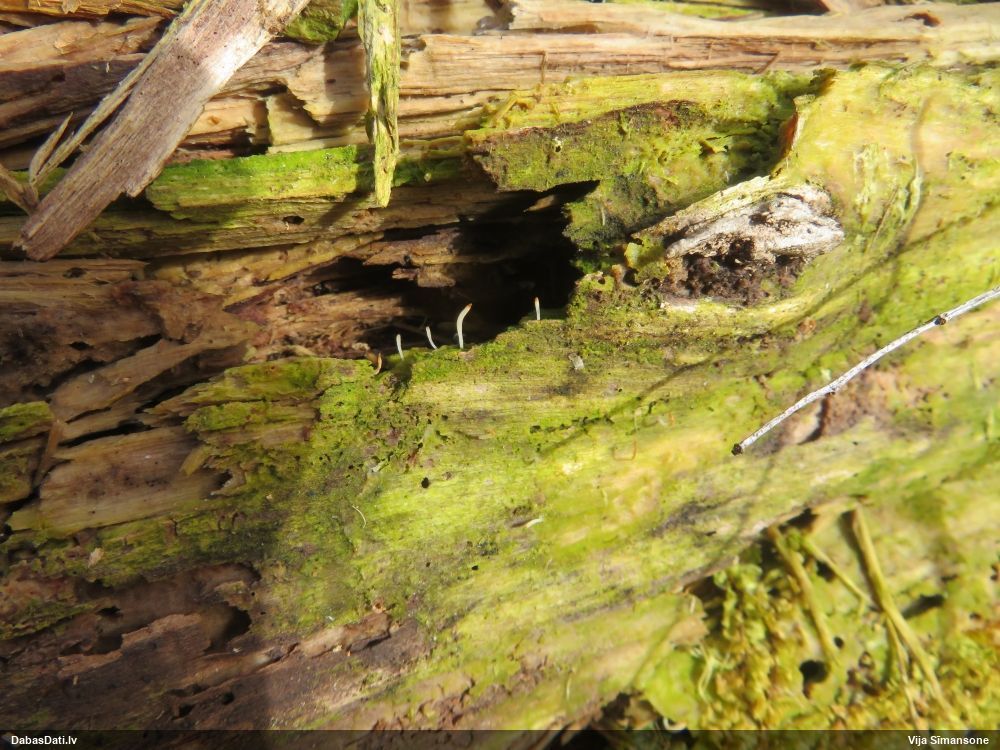 Man pēkšņi radās ideja - vai tur bija nu ļoti mitrs mikroklimats, egle ar melnalksni? Hipotētiski tādas dzeltenas var būt Diachea muscorum. Te bilde ir mazliet līdzīga: https://fr.wikipedia.org/wiki/Fichier:Craterium_muscorum,_Trawscoed,_North_Wales,_Aug_2016_-_Flickr_-_janetgraham84.jpg