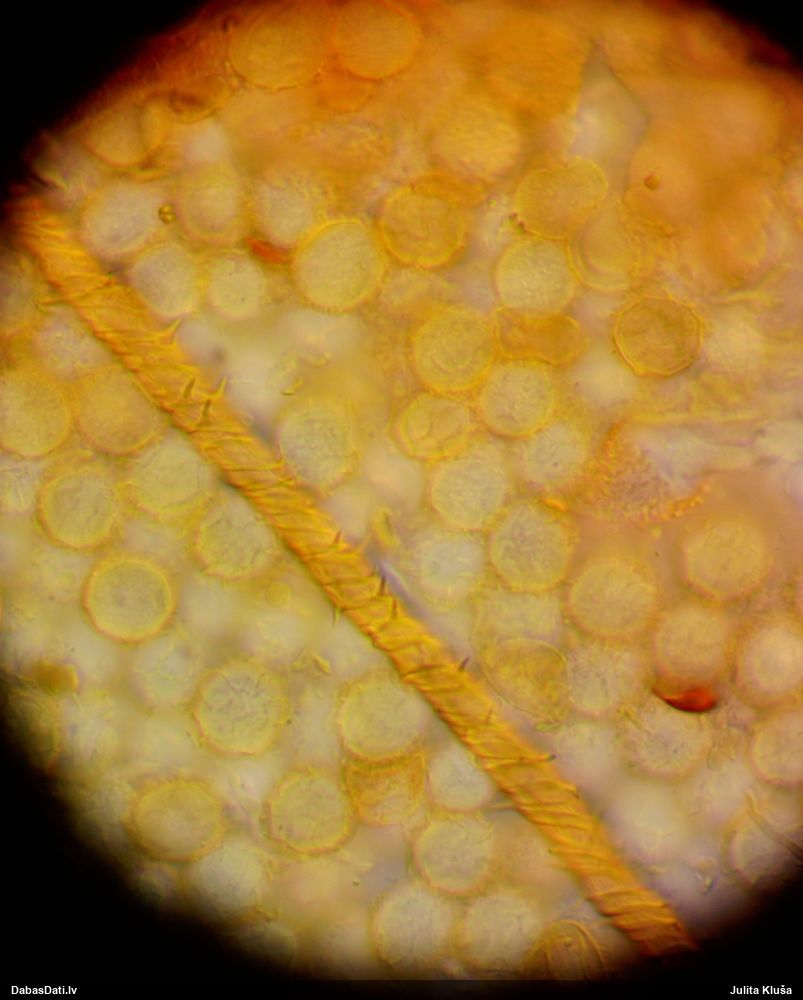 Sporas izskatās ļoti gaišas, varbūt nenobriedušas. Es laikam pēc kāda laiciņa mēģinātu vēlreiz mikroskopēt. Tajā pašā laikā sporu izmēri priekš T.contorta ir pamazi (ja tipiski ir 11-14 mkm, te ir knapi 11 mkm)