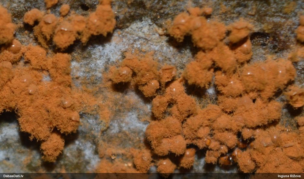 Ja uz beigta koka, tad ticamākā laikam ir B.affinis var. microspora, lai gan tā aug uz mizas. Bet varbūt tieši apakšā gļotsēnēm ir kādi mizas fragmentiņi?