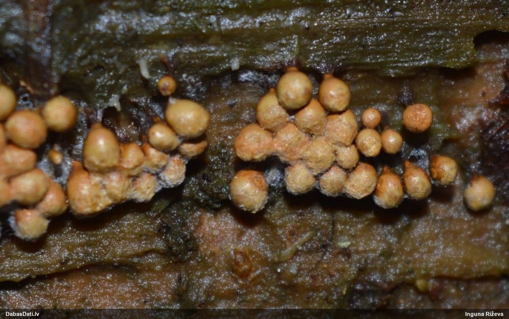 Ja uz beigta koka, tad ticamākā laikam ir B.affinis var. microspora, lai gan tā aug uz mizas. Bet varbūt tieši apakšā gļotsēnēm ir kādi mizas fragmentiņi?