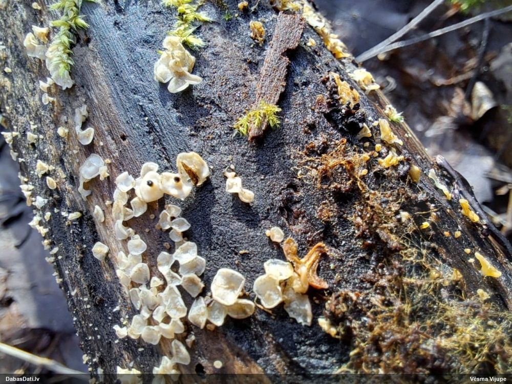 Man pēkšņi radās ideja - vai tur bija nu ļoti mitrs mikroklimats, egle ar melnalksni? Hipotētiski tādas dzeltenas var būt Diachea muscorum. Te bilde ir mazliet līdzīga: https://fr.wikipedia.org/wiki/Fichier:Craterium_muscorum,_Trawscoed,_North_Wales,_Aug_2016_-_Flickr_-_janetgraham84.jpg