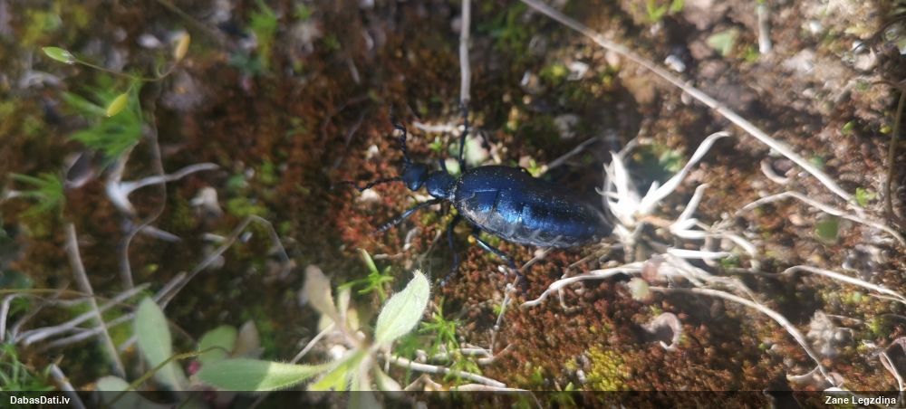 Jāredz tuvāk (kaut vai izkadrēts šis pats attēls) - varbūt tumšā eļļasvabole (Meloe proscarabaeus)