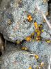 Man pēkšņi radās ideja - vai tur bija nu ļoti mitrs mikroklimats, egle ar melnalksni? Hipotētiski tādas dzeltenas var būt Diachea muscorum. Te bilde ir mazliet līdzīga: https://fr.wikipedia.org/wiki/Fichier:Craterium_muscorum,_Trawscoed,_North_Wales,_Aug_2016_-_Flickr_-_janetgraham84.jpg