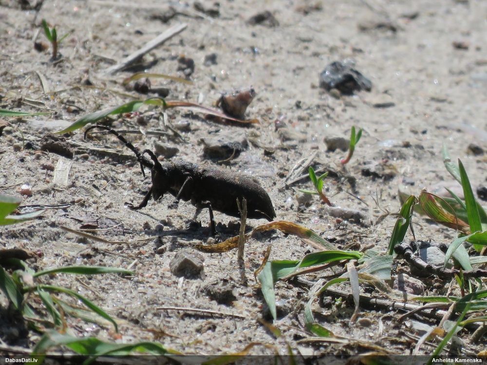 Jāredz tuvāk (kaut vai izkadrēts šis pats attēls) - varbūt tumšā eļļasvabole (Meloe proscarabaeus)
