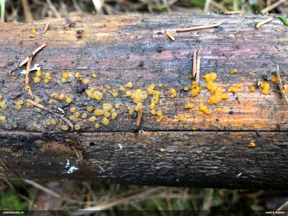 Man pēkšņi radās ideja - vai tur bija nu ļoti mitrs mikroklimats, egle ar melnalksni? Hipotētiski tādas dzeltenas var būt Diachea muscorum. Te bilde ir mazliet līdzīga: https://fr.wikipedia.org/wiki/Fichier:Craterium_muscorum,_Trawscoed,_North_Wales,_Aug_2016_-_Flickr_-_janetgraham84.jpg
