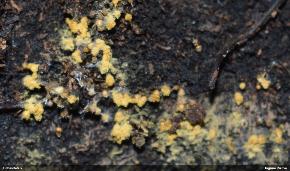 Man pēkšņi radās ideja - vai tur bija nu ļoti mitrs mikroklimats, egle ar melnalksni? Hipotētiski tādas dzeltenas var būt Diachea muscorum. Te bilde ir mazliet līdzīga: https://fr.wikipedia.org/wiki/Fichier:Craterium_muscorum,_Trawscoed,_North_Wales,_Aug_2016_-_Flickr_-_janetgraham84.jpg