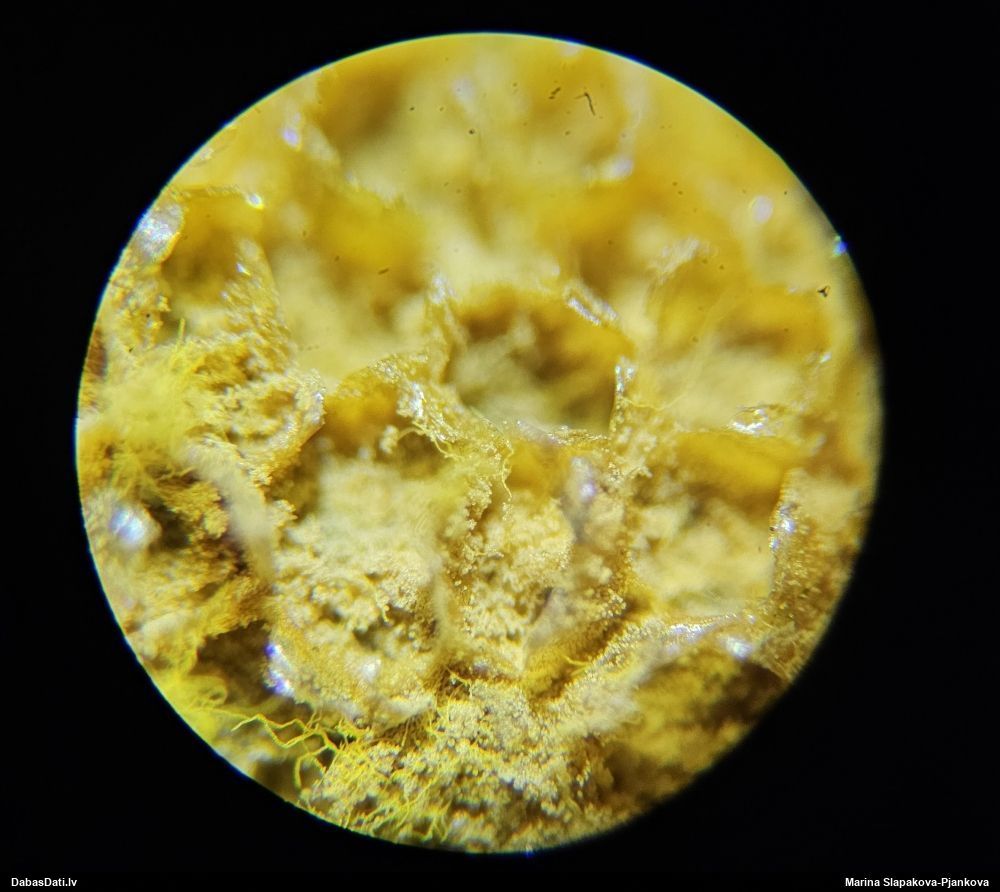 Paldies, Raivo! Ar acu gaišumu man arvien sliktāk, bet mikroskops palīdz. Jā, gribēju teikt, ka paraugam, ja vien nav kāda jutīga atradne, kurai drīkst ievākt tikai mazu gabaliņu, vērts ievākt lielāku gabalu, jo gļotsēnēm patīk kompānija. Un mikroskopa mazajos palielinājumos ar sānu papildus apgaismojumu ir vērts rūpīgi "izstaigāt" visu paraugu. Arī ķērpjus un interesantas sīksēnītes tā var atrast, ko dabā nepamanītu. Ar kriksītēm ir dažādi - pirmās es tā arī tikai citu sugu paraugos pamanīju, bet vēlāk redzēju arī dabā kriskīšu plantācijas - ja to ir daudz, tad var pamanīt jau dabā. Uz sūnām gan ir ekstrēms gadījums, dabā droši nepamanītu, arī eksemplāra noņemšana no sūnas nebija pārāk veiksmīga, tāpēc par noteikšanu mazliet šaubos (sporām mazliet cits tonis). Bet pagaidām citas hipotēzes nav (un konkrētā eksemplāra arī vairs ne).
