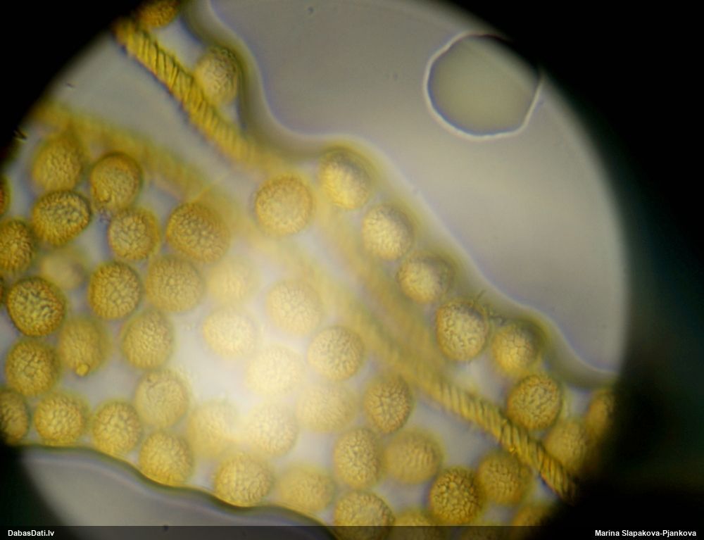 Paldies, Raivo! Ar acu gaišumu man arvien sliktāk, bet mikroskops palīdz. Jā, gribēju teikt, ka paraugam, ja vien nav kāda jutīga atradne, kurai drīkst ievākt tikai mazu gabaliņu, vērts ievākt lielāku gabalu, jo gļotsēnēm patīk kompānija. Un mikroskopa mazajos palielinājumos ar sānu papildus apgaismojumu ir vērts rūpīgi "izstaigāt" visu paraugu. Arī ķērpjus un interesantas sīksēnītes tā var atrast, ko dabā nepamanītu. Ar kriksītēm ir dažādi - pirmās es tā arī tikai citu sugu paraugos pamanīju, bet vēlāk redzēju arī dabā kriskīšu plantācijas - ja to ir daudz, tad var pamanīt jau dabā. Uz sūnām gan ir ekstrēms gadījums, dabā droši nepamanītu, arī eksemplāra noņemšana no sūnas nebija pārāk veiksmīga, tāpēc par noteikšanu mazliet šaubos (sporām mazliet cits tonis). Bet pagaidām citas hipotēzes nav (un konkrētā eksemplāra arī vairs ne).