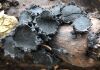 Šis interesants. Uz sausām priedes kritalām rozā mazi līdzīga izskata augļķermeņi maijā aug divām citādi atšķirīgām sugām (dažādās dzimtās) - melnajai plaispikai Amaurochaete atra un trauslajam gļotpūpēdim Reticularia jurana. Pēc sīkām mikropazīmēm (foto nav redzama pat ne sīka balta pakāje ap augļķermeni, un uz virsmas ar lielu piepūli var ja ne saskatīt, tad iztēloties tīklotu virsmas rakstu) izšķīros par biežāko no abām - melno plaispiku, kas tipiski aug samērā atklātās, skrajās vietās, t.sk. nesenos izcirtumos.