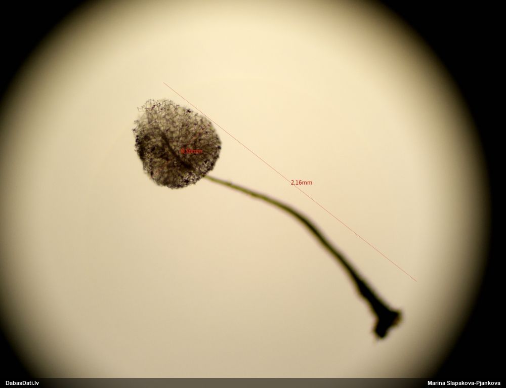 Paldies, Raivo! Ar acu gaišumu man arvien sliktāk, bet mikroskops palīdz. Jā, gribēju teikt, ka paraugam, ja vien nav kāda jutīga atradne, kurai drīkst ievākt tikai mazu gabaliņu, vērts ievākt lielāku gabalu, jo gļotsēnēm patīk kompānija. Un mikroskopa mazajos palielinājumos ar sānu papildus apgaismojumu ir vērts rūpīgi "izstaigāt" visu paraugu. Arī ķērpjus un interesantas sīksēnītes tā var atrast, ko dabā nepamanītu. Ar kriksītēm ir dažādi - pirmās es tā arī tikai citu sugu paraugos pamanīju, bet vēlāk redzēju arī dabā kriskīšu plantācijas - ja to ir daudz, tad var pamanīt jau dabā. Uz sūnām gan ir ekstrēms gadījums, dabā droši nepamanītu, arī eksemplāra noņemšana no sūnas nebija pārāk veiksmīga, tāpēc par noteikšanu mazliet šaubos (sporām mazliet cits tonis). Bet pagaidām citas hipotēzes nav (un konkrētā eksemplāra arī vairs ne).