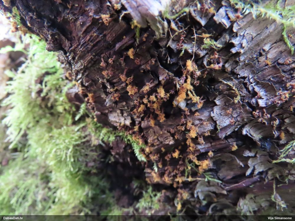 Šobrīd varu iedomāties 2 variantus - melnā plaispika Amaurochaete atra vai parastais gļotpūpēdis Reticularia lycoperdon. Pēc izmēra, augšanas laika un augšanas uz apstrādāta koka atbilst abas.