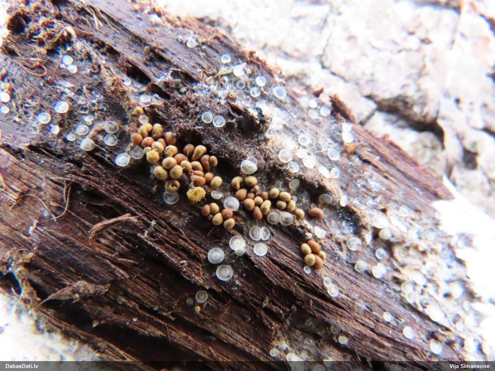 Paldies, Raivo! Ar acu gaišumu man arvien sliktāk, bet mikroskops palīdz. Jā, gribēju teikt, ka paraugam, ja vien nav kāda jutīga atradne, kurai drīkst ievākt tikai mazu gabaliņu, vērts ievākt lielāku gabalu, jo gļotsēnēm patīk kompānija. Un mikroskopa mazajos palielinājumos ar sānu papildus apgaismojumu ir vērts rūpīgi "izstaigāt" visu paraugu. Arī ķērpjus un interesantas sīksēnītes tā var atrast, ko dabā nepamanītu. Ar kriksītēm ir dažādi - pirmās es tā arī tikai citu sugu paraugos pamanīju, bet vēlāk redzēju arī dabā kriskīšu plantācijas - ja to ir daudz, tad var pamanīt jau dabā. Uz sūnām gan ir ekstrēms gadījums, dabā droši nepamanītu, arī eksemplāra noņemšana no sūnas nebija pārāk veiksmīga, tāpēc par noteikšanu mazliet šaubos (sporām mazliet cits tonis). Bet pagaidām citas hipotēzes nav (un konkrētā eksemplāra arī vairs ne).
