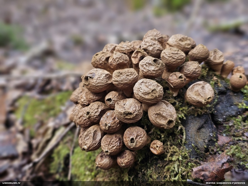 Tā ir tipiska pavasara sēne (ne gļotsēne), tikai uzreiz neatceros nosaukumu, ja vien tur tagad nebija vairāki varianti iespējami