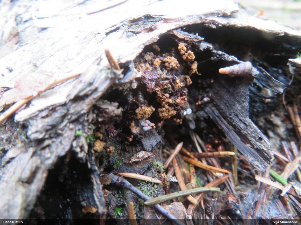 Satrūdējusi kritala mežā, nav dēļi. Iespējams, egle, jauktu koku mežs.