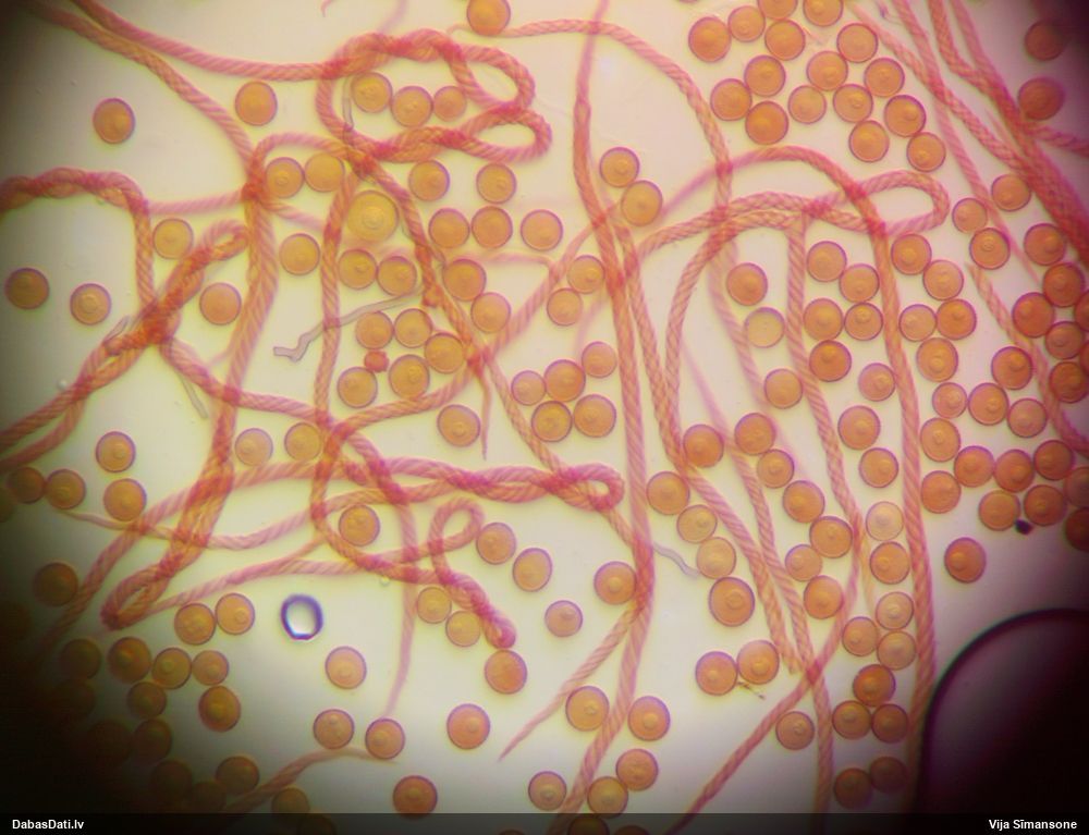 Sporas izskatās ļoti gaišas, varbūt nenobriedušas. Es laikam pēc kāda laiciņa mēģinātu vēlreiz mikroskopēt. Tajā pašā laikā sporu izmēri priekš T.contorta ir pamazi (ja tipiski ir 11-14 mkm, te ir knapi 11 mkm)