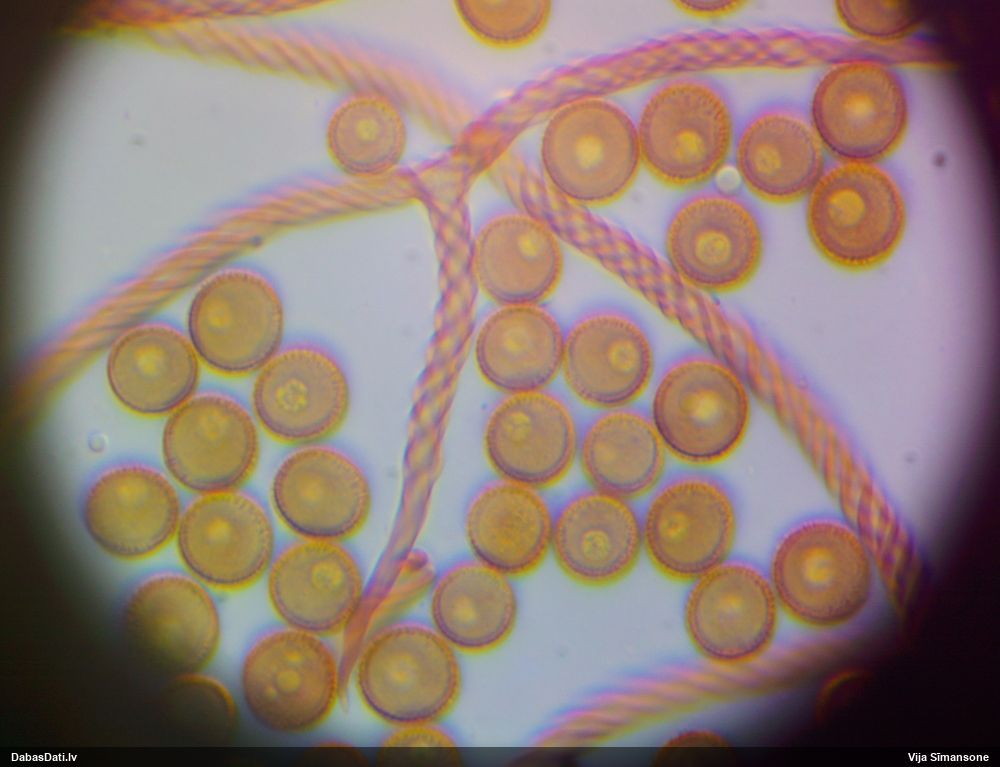 Sporas izskatās ļoti gaišas, varbūt nenobriedušas. Es laikam pēc kāda laiciņa mēģinātu vēlreiz mikroskopēt. Tajā pašā laikā sporu izmēri priekš T.contorta ir pamazi (ja tipiski ir 11-14 mkm, te ir knapi 11 mkm)