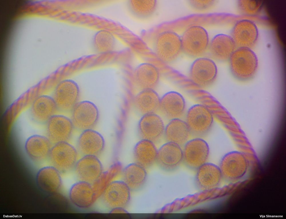 Sporas izskatās ļoti gaišas, varbūt nenobriedušas. Es laikam pēc kāda laiciņa mēģinātu vēlreiz mikroskopēt. Tajā pašā laikā sporu izmēri priekš T.contorta ir pamazi (ja tipiski ir 11-14 mkm, te ir knapi 11 mkm)